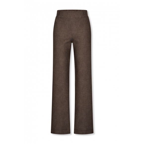 Pantalon van Helena Hart in een warme bruine tint met een verfijnde linnenlook structuur die zorgt voor een luxe en tijdloze uitstraling. De stof voelt comfortabel aan en valt soepel langs het lichaam, terwijl de rechte, wijde pijpen een elegant silhouet creëren. Een perfecte basis voor zowel zakelijke als casual looks.