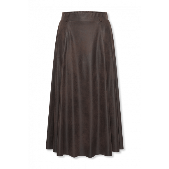 Rok van het merk Helena Hart in een chocoladebruine kleur. Dit model heeft een uitlopende pasvorm en is voorzien van riemlussen in de taille en een elastische band aan de achterkant voor extra comfort. De rok is uitgevoerd in een leatherlook materiaal dat zacht en soepel valt, wat zorgt voor een stoere maar vrouwelijke uitstraling.