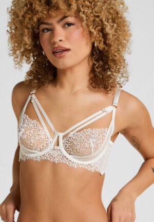 Voeg een vleugje romantiek toe aan je looks met deze mesh beugel bh, versierd met een delicaat hartjesborduursel. Dankzij de transparante cups en zachte structuur geven biedt deze bh een natuurlijke ondersteuning met een licht, luchtig gevoel. Perfect om je lingerielook een gedurfde maar vrouwelijke touch te geven. Combineer het met een bijpassende slip voor een sensuele, matchende look. Niet voorgevormd Verstelbare schouderbandjes Met beugel Kant