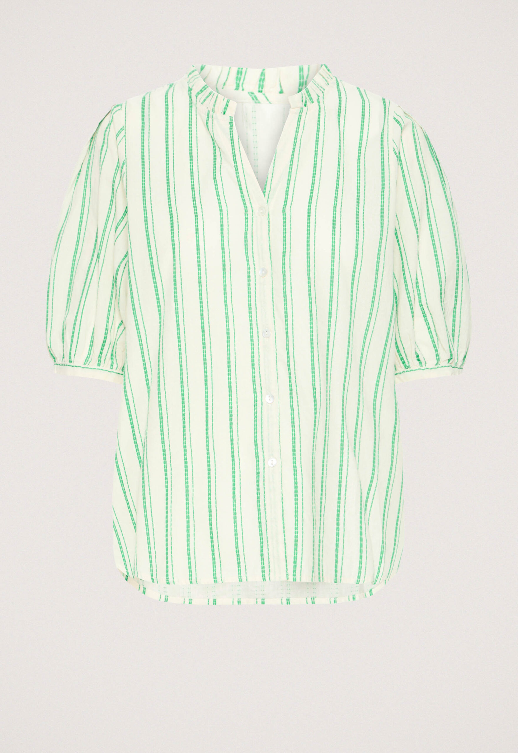 Dit is de 20125508 Jovil Blouse van het merk Ichi. Deze blouse is gemaakt van 100% katoen, wat zorgt voor een zacht en ademend gevoel. Het ontwerp is voorzien van een stijlvolle V-hals en korte mouwen, ideaal voor warmere dagen.