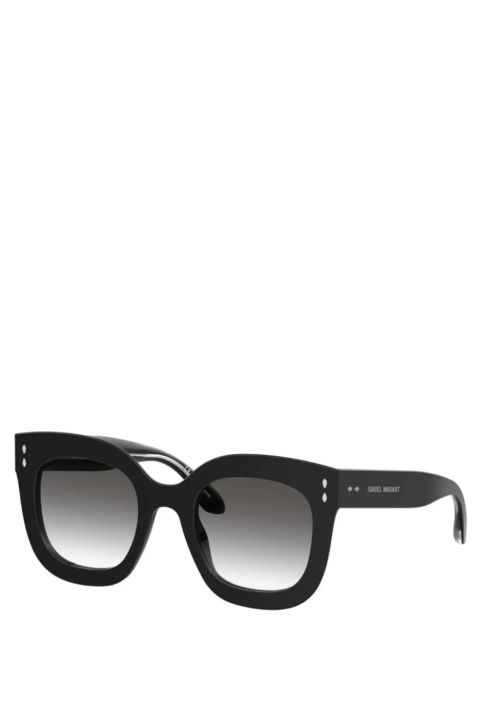 Hier zie je de zonnebril black van Isabel Marant. Het zwarte, rechthoekige montuur voelt stevig aan door de dikke randen met afgeronde hoeken. De donker getinte glazen lopen licht in kleur over van boven naar beneden, wat het gezicht rustig omlijst. Op de voorzijde bij de scharnieren staan twee kleine zilverkleurige stippen die het ontwerp subtiel afwerken. De stijl past mooi bij de Franse flair van Isabel Marant, waarbij de vormen altijd goed zijn uitgedacht en prettig dragen.