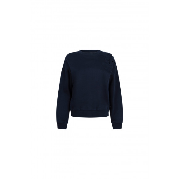 Sweater van Jansen. Comfortabele sweater in navy met ronde hals en relaxte pasvorm. Het ton sur ton bloemenborduursel op de schouder geeft dit sportieve item een vrouwelijke en verfijnde touch.