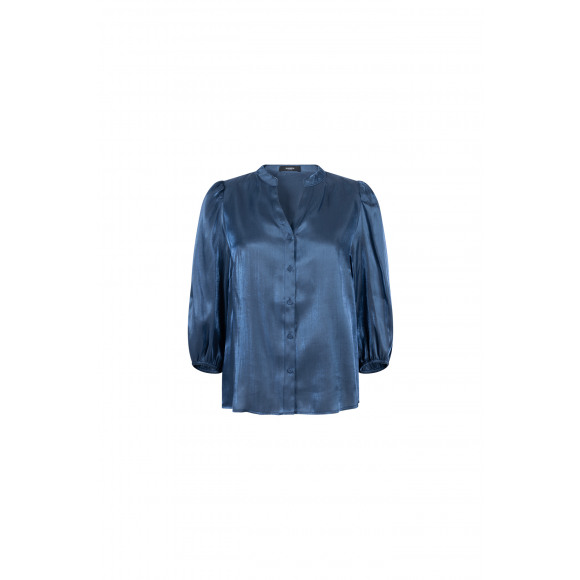 Blouse van het merk Jansen Amsterdam. Deze glanzende donkerblauwe blouse heeft een subtiele V-hals en een elegante knoopsluiting. De licht gepofte mouwen tot de elleboog geven het model een vrouwelijke en moderne uitstraling.