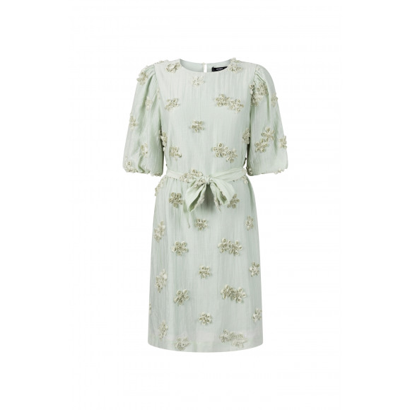 Jurk van Jansen Amsterdam. Deze romantische jurk in een zachte mintgroene tint is een echte blikvanger dankzij de verfijnde 3D-bloemetjes die over de stof zijn verwerkt. De luchtige, licht transparante kwaliteit geeft de jurk een elegante en zomerse uitstraling. De pofmouwen zorgen voor een speels volume en met het bijpassende ceintuur creëer je moeiteloos een mooi vrouwelijk silhouet. Perfect voor een feestje, een diner of een zonnige dag.