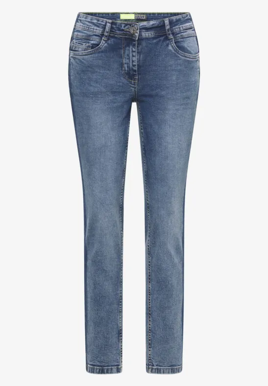 De Scarlett stijljeans van CECIL voor dames combineert een casual pasvorm met Slim Legs en sportieve galon strepen. De lichtblauwe wassing geeft de look een frisse touch, terwijl de katoenen stof met stretch zorgt voor een comfortabele pasvorm. Deze casual fit jeans is ideaal voor een relaxte alledaagse look.