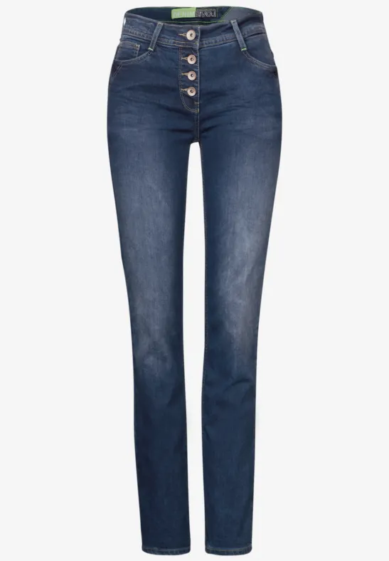 Deze jeans met rechte pijpen van CECIL voor dames in een mid-waist ontwerp maakt indruk met zijn klassieke blauwe wassing en knoopsluiting. De rechte pijpen en de katoenmix met stretch bieden een comfortabele pasvorm en veelzijdige stylingopties. Perfect voor een tijdloze casual look.