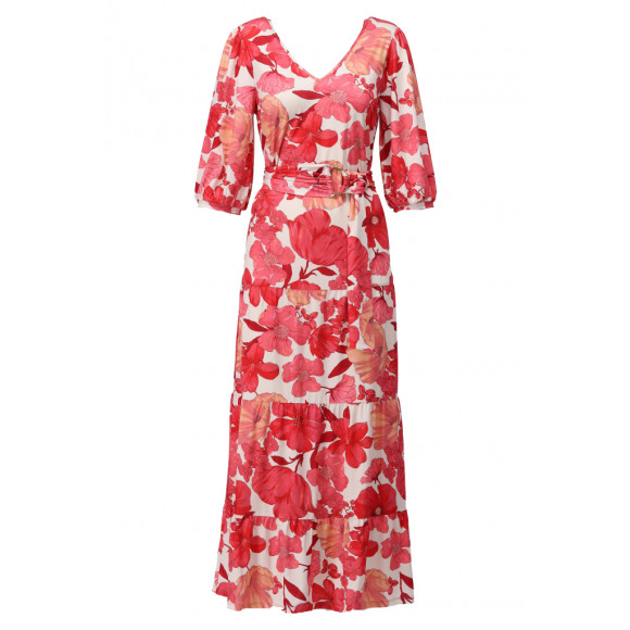 Jurk van K-design. Deze romantische maxi-jurk valt direct op door de rijke bloemenprint in warme rood- en zalmtinten op een lichte basis. De soepelvallende stof en vrouwelijke snit zorgen voor een elegante uitstraling, terwijl de V-hals en de driekwart mouwen met lichte pof het ontwerp een verfijnde, modieuze touch geven. De bijpassende ceintuur accentueert de taille en de strokenrok geeft de jurk een speels, zwierig effect. Een echte blikvanger voor zowel alledaagse momenten als speciale gelegenheden.