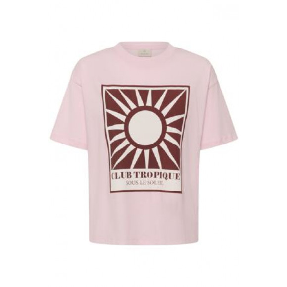 T-shirt van merk Kaffe. Dit zachte T-shirt in een frisse lichtroze kleur heeft een opvallende frontprint met een grafisch zonmotief en tekst, wat zorgt voor een speelse en zomerse uitstraling. De relaxed fit en comfortabele stof maken dit item perfect voor een casual, maar stijlvolle look.