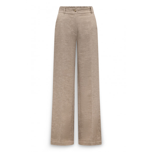 Broek van Label DOT. Deze elegante wide leg pantalon straalt pure klasse uit dankzij de subtiele glans en verfijnde structuur in de stof. De warme zandkleur met metallic effect geeft de broek een luxe uitstraling, terwijl de hoge taille en rechte, wijde pijpen zorgen voor een krachtig en vrouwelijk silhouet. Perfect voor een feestelijke gelegenheid, maar ook prachtig chic te stylen voor overdag.