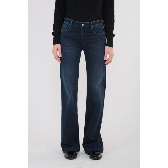 Jeans van het merk Le Temps des Cerises. Deze donkerblauwe jeans heeft een flatterende high waist en een elegante flared pijp. De wassing geeft de broek diepte, terwijl de stretchstof zorgt voor extra comfort en een mooie pasvorm.