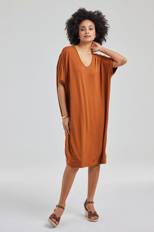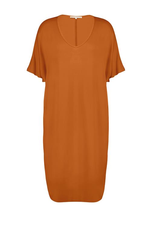 Stijlvol Ontspannen in de Long Loose Dress Elena in Ginger Brown De Long loose dress Elena in Ginger brown is de perfecte aanvulling op jouw garderobe. Deze prachtige jurk in een warme beige/bruine tint biedt een loose fit die bijdraagt aan een comfortabele en moeiteloze look. Met een V-hals en korte mouwen straalt de jurk een casual elegantie uit, perfect voor een zorgeloze, luchtige dag. De regular waist zorgt ervoor dat je er altijd stijlvol uitziet, ongeacht de gelegenheid. Gemaakt van Hoogwaardige Stof De jurk is vervaardigd van 95% Vorteks viscose en 5% elasthan, wat zorgt voor een uitzonderlijk zachte en soepele stof. Vorteks viscose staat bekend om zijn ademende en lichte eigenschappen, ideaal voor een warme dag. De toevoeging van elasthan geeft net dat beetje extra stretch, waardoor de jurk altijd comfortabel zit. Deze combinatie van materialen is niet alleen duurzaam, maar zorgt ook voor een luxe gevoel tijdens het dragen. Stijladvies Combineer de Long loose dress Elena in Ginger brown met je favoriete accessoires voor een complete look. De jurk staat prachtig met een heerlijke broek of een strakke jeans voor een casual uitstraling. Voeg een paar sandalen of hakken toe om je outfit helemaal af te maken. Door de veelzijdigheid van de jurk ben je klaar voor zowel een ontspannen dag als een chic avondje uit. Wasvoorschrift Wassen: Was de jurk op 30 graden om de stof in topconditie te houden. Droogvoorschrift: Vermijd de droger en laat de jurk aan de lucht drogen om krimp te voorkomen. Strijkvoorschrift: Strijk op lage temperatuur voor een gladde en verzorgde look. Vermijd bleken en chemisch reinigen om de kwaliteit van de stof te behouden. Met de Long loose dress Elena in Ginger brown haal je een veelzijdig en stijlvol kledingstuk in huis dat je het hele jaar door moeiteloos kunt dragen.