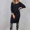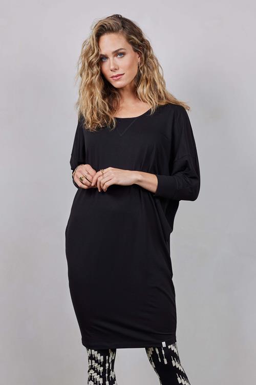 Loose dress Cozy in zwart: Tijdloze Elegantie De Loose dress Cozy in zwart is de perfecte aanvulling voor je kledingcollectie. Deze jurk is ontworpen met een losse pasvorm en lange mouwen, wat hem geschikt maakt voor ieder moment. De elegante zwarte en grijze tinten geven je een stijlvolle uitstraling, perfect om je comfortabel en zelfverzekerd te voelen. De ronde hals zorgt voor een subtiele, maar chique look. Zonder zichtbare sluiting blijft het ontwerp strak en minimalistisch, waardoor de jurk eenvoudig te combineren is met andere items. Gemaakt van hoogwaardige stof De jurk is vervaardigd uit 95% viscose en 5% elasthan, wat zorgt voor een zachte en soepele touch. Deze combinatie van materialen biedt je de perfecte balans tussen comfort en flexibiliteit. Viscose staat bekend om zijn ademende eigenschappen, terwijl elasthan zorgt voor dat beetje extra rek. Hierdoor beweegt de stof met je mee, en behoudt het kledingstuk toch zijn vorm na vele keren dragen. Stijladvies Combineer de Loose dress Cozy in zwart met een paar opvallende accessoires voor een stijlvolle avond uit, of draag hem boven een legging en sneakers voor een casual look overdag. De veelzijdigheid van deze jurk maakt het een onmisbaar item in je kledingkast. Wasvoorschrift Wassen: Kies voor een zachte wasbeurt op maximaal 30 graden om de stof en kleur te behouden. Drogen: Hang de jurk op een kleerhanger om natuurlijk te drogen. Vermijd het gebruik van een droger om krimp te voorkomen. Strijken: Strijk de jurk op een lage temperatuur voor het beste resultaat. Deze Loose dress Cozy in zwart biedt de juiste mix van elegantie en comfort, ideaal voor een moderne, veelzijdige garderobe.