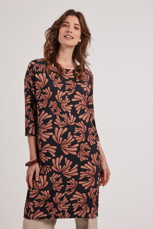 Loose dress Easy Blue Cocktail print Ervaar de moeiteloze stijl van de Loose dress Easy Blue Cocktail print. Met een aantrekkelijk blauw design en een luchtig karakter is deze jurk ideaal voor de warmere dagen. De driekwart mouwen en de ronde hals geven de jurk een moderne uitstraling. Dankzij de loose fit biedt de jurk comfort zonder concessies aan stijl. Geniet van een outfit die perfect past bij de zonnige maanden en je een frisse en levendige uitstraling geeft. Gemaakt van hoogwaardige stof De Loose dress Easy Blue Cocktail print is vervaardigd uit een hoogwaardige blend van 95% viscose en 5% elasthan. Deze combinatie zorgt ervoor dat de stof heerlijk soepel en zacht aanvoelt op je huid. Viscose staat bekend om zijn ademende eigenschappen, waardoor de jurk ideaal is voor warmere temperaturen. Het elasthan zorgt voor net dat beetje extra flexibiliteit, zodat je je vrij kunt bewegen zonder beperkingen. Stijladvies Combineer de Loose dress Easy Blue Cocktail print met sandalen voor een casual look op een zonnige dag, of draag hem met stijlvolle hakken voor een avondje uit. Voeg accessoires toe zoals een riem om de taille te accentueren, of draag de jurk zoals hij is voor een relaxed silhouet. Deze veelzijdige jurk past bij verschillende gelegenheden en maakt je eenvoudig elegant. Wasvoorschrift Wasonderhoud: Voor het behouden van de kwaliteit van je jurk, was deze op 30 graden met vergelijkbare kleuren. Vermijd het gebruik van bleekmiddel om de kleuren levendig te houden. Droogvoorschrift: Het wordt aangeraden om de jurk niet in de droger te doen. Laat hem in plaats daarvan aan de lucht drogen voor het beste resultaat. Strijkvoorschrift: Strijk op een lage temperatuur om kreukels te verwijderen zonder de stof te beschadigen. Volg deze eenvoudige stappen om je jurk er altijd op zijn best uit te laten zien.