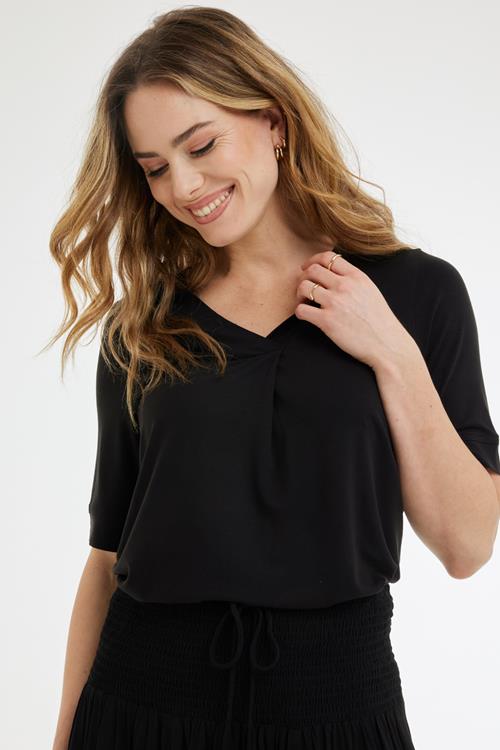 Stijlvol Comfort met de Loose Tee Bacio Black Ervaar het ultieme comfort en stijl met de Loose Tee Bacio Black. Deze veelzijdige T-shirt is perfect te combineren met je favoriete kledingstukken. Het tijdloze zwart-grijze ontwerp straalt elegantie uit, terwijl de korte mouwen en V-hals zorgen voor een frisse, uitnodigende look. Het rechte model maakt het een soepele aanvulling voor elke garderobe. Gemaakt van hoogwaardige stof Onze Loose Tee Bacio Black is vervaardigd uit 95% viscose en 5% elasthan. Dit premium materiaal staat bekend om zijn zachte en ademende eigenschappen, perfect voor een comfortabele dag. De elasthan geeft het shirt een lichte stretch, waardoor je vrij kunt bewegen. Ideaal voor elk seizoen, klaar om met je mee te gaan waar je ook bent. Stijladvies Voor een casual, maar toch chique look, kun je de Loose Tee Bacio Black eenvoudig combineren met een mooie jeans. De subtiele kleurstelling maakt het een veelzijdig kledingstuk dat zowel op kantoor als in je vrije tijd gedragen kan worden. Voeg eventueel een vest of sjaal toe voor een extra modieuze touch. Wasvoorschrift Was instructie: Zorg ervoor dat je deze blouse wast op 30 graden om de stof en kleur te behouden. Gebruik een fijnwasmiddel om de levensduur van je blouse te verlengen. Droogvoorschrift: Vermijd de droger en laat je blouse aan de lucht drogen. Dit behoudt de vorm en elasticiteit van het kledingstuk. Strijkvoorschrift: Strijk je blouse op een lage temperatuur om kreukels glad te strijken zonder de stof te beschadigen. Met de Loose Tee Bacio Black voeg je een veelzijdig en comfortabel stuk toe aan je kledingcollectie, zonder concessies te doen aan stijl of gemak.