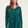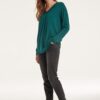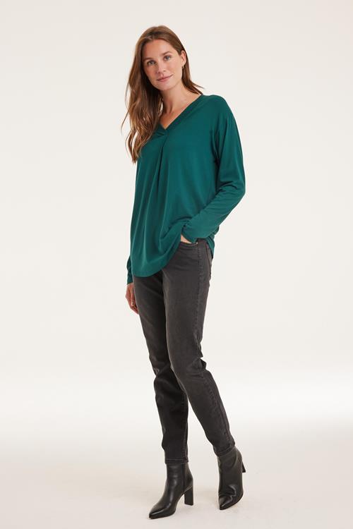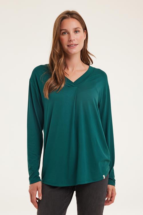 Loose tee Cindy Sea moss green – Jouw nieuwe favoriet De Loose tee Cindy Sea moss green combineert tijdloze stijl met ultiem comfort. Met zijn prachtige groene kleur en lange mouwen is deze blouse perfect voor als je op zoek bent naar iets dat zowel fris als veelzijdig is. Het model heeft een loose fit en rechte pasvorm, wat zorgt voor een ontspannen en casual uitstraling. De V-hals voegt een vleugje elegantie toe, ideaal voor elke dag van het jaar. Gemaakt van hoogwaardige stof Gemaakt van 95% viscose en 5% elasthan, biedt de stof een soepele en zachte aanraking op je huid. Deze combinatie zorgt ervoor dat de blouse mooi valt en comfortabel zit. Viscose staat bekend om zijn ademende eigenschappen en houd je koel op warme dagen, terwijl het elasthan zorgt voor bewegingsvrijheid en vormbehoud. Stijladvies Deze blouse is een veelzijdige toevoeging aan je garderobe. Combineer de Loose tee Cindy Sea moss green met een mooie jeans voor een moeiteloze en stijlvolle look. Perfect voor zowel een casual uitje als een informele werkdag. Wasvoorschrift Wasvoorschrift: Was de blouse op 30 graden om de kwaliteit te behouden. Gebruik een mild wasprogramma zonder te bleken of chemisch te reinigen. Droogvoorschrift: Hang de blouse op om te drogen en vermijd het gebruik van de droger om de stof te beschermen. Strijkvoorschrift: Strijk indien nodig op lage temperatuur om de oorspronkelijke look te behouden. Met deze onderhoudstips blijft je nieuwe favoriet er als nieuw uitzien en kun je er nog lang van genieten.
