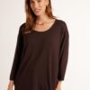 Loose tee crew 3/4 sleeves Chocolate brown – Jouw veelzijdige must-have Ervaar comfort en stijl met de Loose tee crew 3/4 sleeves Chocolate brown. Deze tijdloze klassieker is ontworpen voor veelzijdigheid en past perfect in elke garderobe. Met zijn zachte beige/bruine tint en losse pasvorm is dit T-shirt ideaal voor elk seizoen. De driekwart mouwen en ronde halslijn geven de top een luchtige uitstraling, waardoor het een geweldige keuze is voor zowel casual als meer geklede looks. Gemaakt van hoogwaardige stof Dit shirt is vervaardigd uit 95% viscose en 5% elasthan, wat zorgt voor een optimale mix van zachtheid en flexibiliteit. De ademende en soepele stof maakt dit kledingstuk niet alleen comfortabel, maar ook duurzaam, zodat je er seizoenenlang plezier van hebt. Het elastische materiaal beweegt moeiteloos met je mee, wat bijdraagt aan de algehele comfortabele draagervaring. Stijladvies Dit veelzijdige T-shirt laat zich makkelijk combineren met diverse kledingstukken. Probeer het te matchen met een mooie jeans voor een stijlvolle en toch casual uitstraling. Voeg een paar opvallende accessoires toe om je look compleet te maken. De neutrale kleur zorgt ervoor dat jij altijd moeiteloos in de mode blijft, ongeacht het seizoen. Wasvoorschrift Wassen: Voor het behoud van de kwaliteit was je het T-shirt het beste op 30 graden. Dit houdt de kleuren fris en de stof in goede conditie. Droogvoorschrift: Vermijd de droger om krimp en schade te voorkomen. Laat het shirt aan de lucht drogen voor een langere levensduur. Strijkvoorschrift: Strijk het T-shirt op een lage temperatuur om de stof zacht en glad te houden. Dit helpt ook om de natuurlijke glans van de viscose te behouden. Met de Loose tee crew 3/4 sleeves Chocolate brown voeg je een betrouwbare en stijlvolle top toe aan je kledingcollectie. Een echte allrounder die klaar staat voor elke outfit en elke gelegenheid.