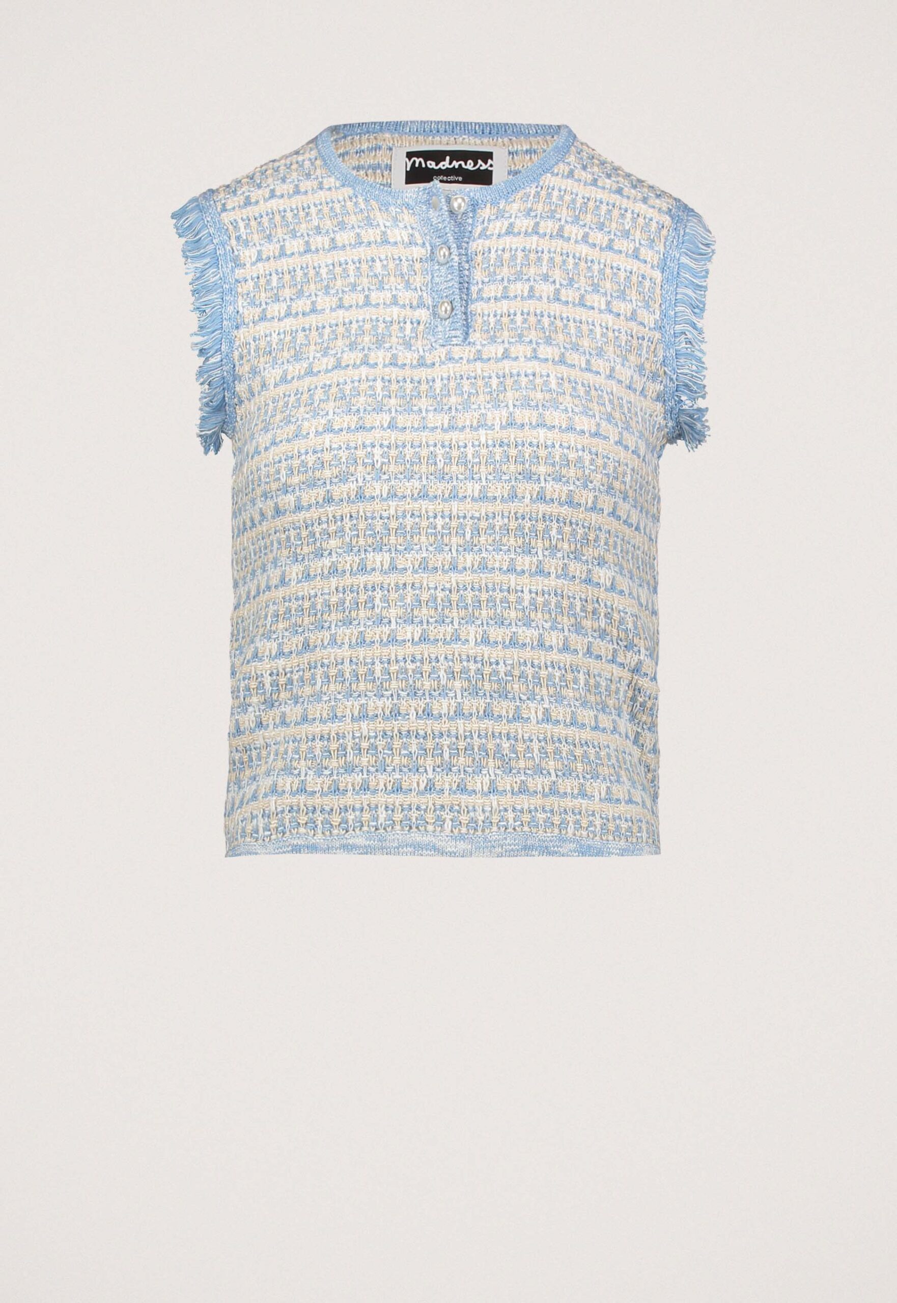 Dit is de MALEAH Maleah Spencer van het merk Madness. Deze Spencer heeft een comfortabele pasvorm en is gemaakt van een zachte katoenmix met polyester. De top is mouwloos met een ronde hals en heeft een stijlvolle parel knoopsluiting aan de voorkant. De gerafelde, afgesneden mouwen geven deze Spencer een unieke touch.