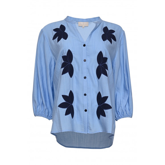 Blouse van het merk Maicazz. Deze luchtige blouse in een zachte lichtblauwe tint is verrijkt met opvallende donkerblauwe applicaties in een bloemvorm, wat zorgt voor een speelse en stijlvolle uitstraling. De blouse heeft een losvallende pasvorm en is gemaakt van een licht transparante, ademende stof die heerlijk draagt op warme dagen. De V-hals met knoopsluiting en de driekwart mouwen met elastische boorden geven het geheel een vrouwelijke en casual look. De subtiele structuur in de stof voegt extra diepte toe aan het ontwerp.