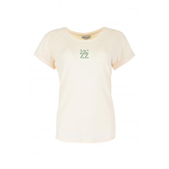 T-shirt met logootje op het voorpand van het merk Maicazz. Dit shirtje heeft korte mouwen en een ronde hals.