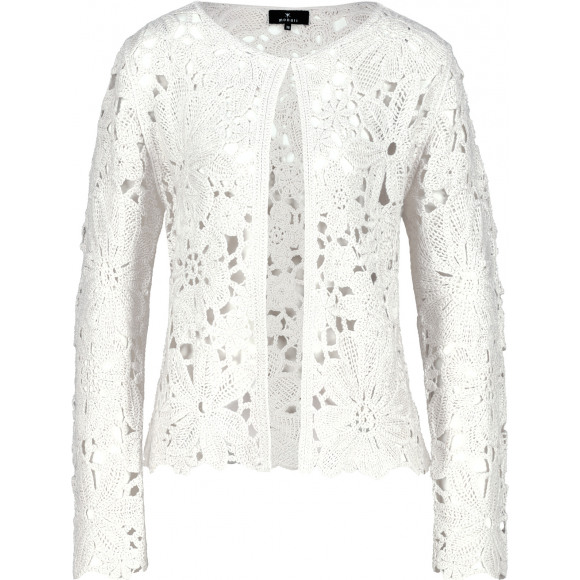 Opengewerkt bloemen vestje van het merk Monari. Dit vestje lijkt hierdoor helemaal van kant gemaakt, maar draagt zacht door het viscose materiaal. Hij heeft een ronde hals en enkele knoopsluiting bij de hals. Wil je hem casual dragen, dan kan je hem dragen op een jeans. Wil je hem netter dragen, dan combineer je hem op een pantalon of rok.