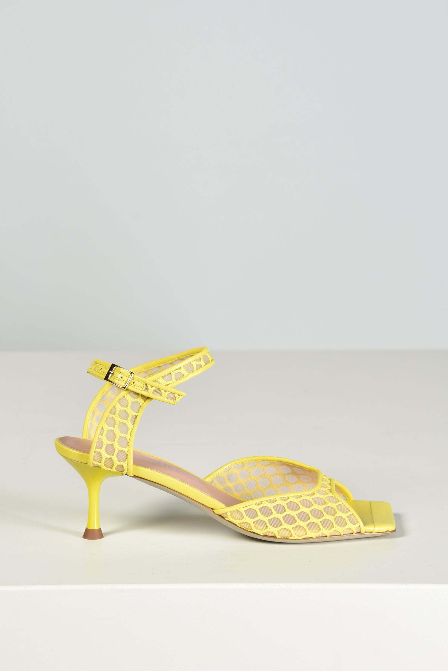 De sandalen Griselda in geel van Morobe trekken meteen de aandacht met hun opengewerkte mesh bandjes. De structuur van het honingraatpatroon geeft lucht en lichtheid, terwijl de leren afwerking zorgt voor stevigheid en finesse. De vierkante neus en slanke hak maken het ontwerp modern en in balans. Het smalle enkelbandje met gesp sluit mooi rond de enkel en benadrukt de elegante vorm van de voet. De kleur soleil geeft de sandaal een zonnige tint die goed uitkomt bij een lichte of denim look. Morobe, het Belgische label van ontwerpster Virginie Morobé, staat bekend om het combineren van sculpturale vormen en rijke materialen. Dat zie je terug in deze Griselda-sandaal: een ontwerp dat luxe en vakmanschap subtiel laat samenkomen. De sandalen vallen normaal op maat. Combineer ze bijvoorbeeld met de Morobe sandalen Griselda 14 dentelle navy voor een stijlvolle toon-op-toon set.