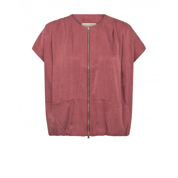 Bomber gilet van Mos Mosh in een warme roodroze tint met een luxe, licht glanzende finish. De soepelvallende stof en het subtiele volume geven dit item een moderne, vrouwelijke uitstraling met een sportieve twist. De combinatie van een bomber silhouet en korte mouwen maakt dit gilet perfect voor het tussenseizoen.