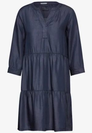 De midi-jurk van CECIL voor dames is een elegante blousejurk met korte mouwen, een klassieke kraag en een knooppas voor een stijlvolle look. Met lussen aan de zijkanten en een strikceintuur benadrukt het de taille, terwijl steekzakken en splitten in de zoom zorgen voor functionaliteit en bewegingsvrijheid. Deze jurk is gemakkelijk te onderhouden en strijkvrij. Hij is de perfecte keuze voor een moeiteloze maar geraffineerde look.