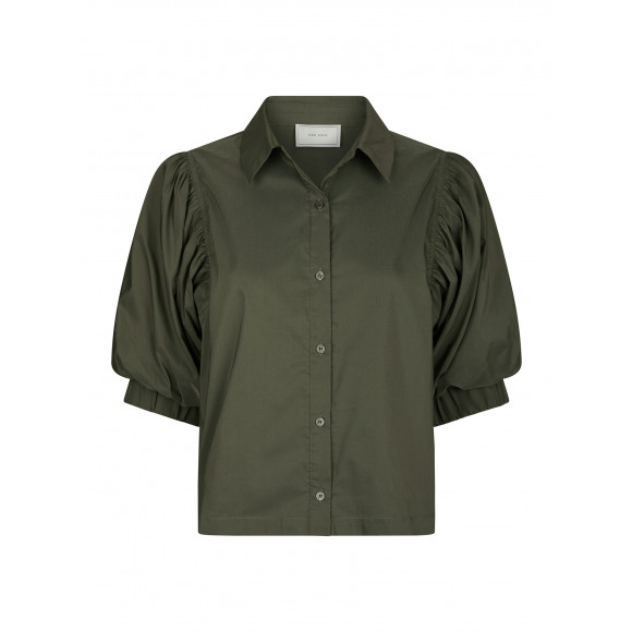 Blouse van Neo Noir. Deze olijfgroene blouse is een echte statement basic: tijdloos, maar met een fashionable twist. De ballonmouwen met plooidetail geven een speelse, vrouwelijke uitstraling, terwijl de klassieke kraag en knoopsluiting zorgen voor een nette, stijlvolle look. Door de luchtige stof draagt de blouse heerlijk comfortabel en is hij perfect voor zowel casual als geklede outfits.