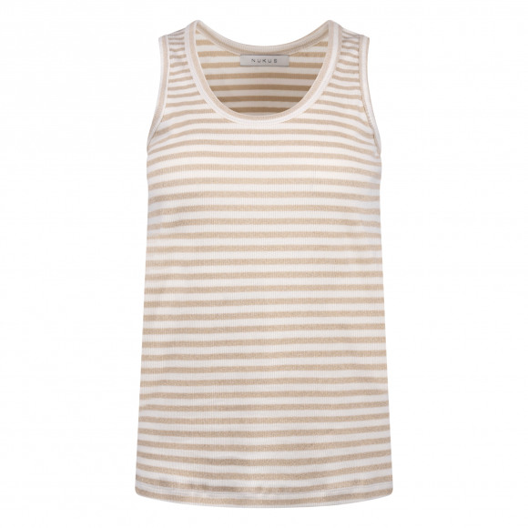 Top van Nukus met een verfijnde, zomerse uitstraling. De subtiele streep in zachte zand- en wittinten geeft deze mouwloze top een frisse en tijdloze look. Dankzij de aansluitende pasvorm en het fijne ribmateriaal draagt hij comfortabel en vormt hij een mooie basis voor talloze outfits.