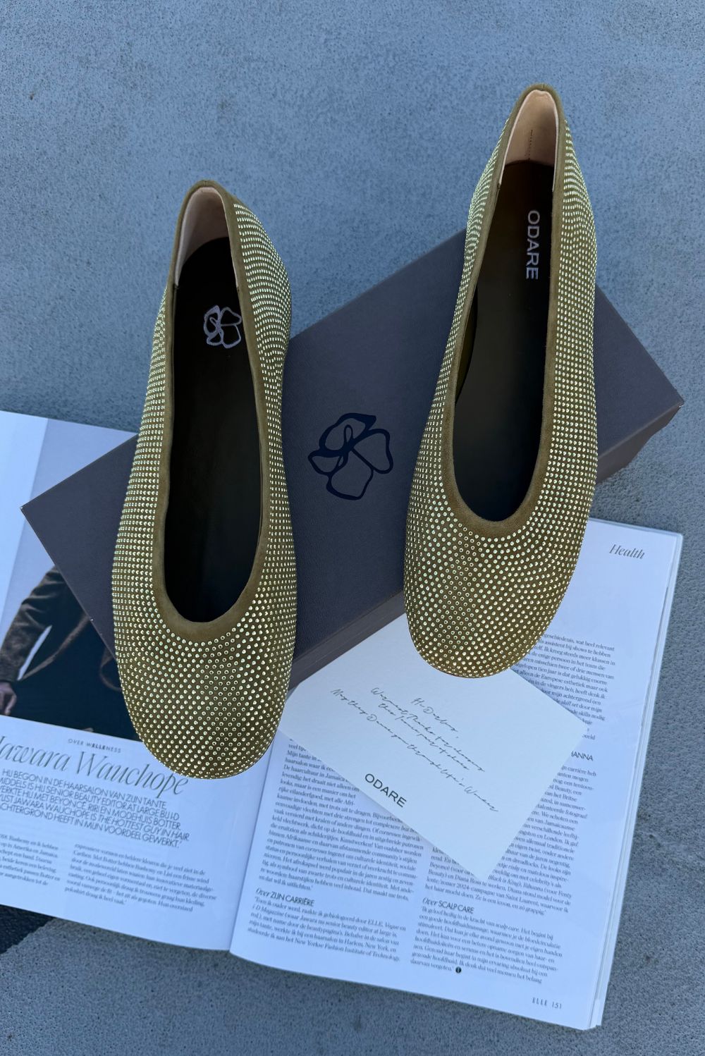 Mag ik je de ballerinas Lilly van Odare laten zien. Deze groene ballerina is uitgevoerd in zacht suède met een volle laag kleine, glinsterende steentjes die het oppervlak rustig laten schitteren. De kleur heeft iets van camoscio aloe en geeft het model een heldere olijfachtige tint. De ronde neus houdt de vorm zacht en vrouwelijk. Door het lichte materiaal voelt de schoen soepel aan. Ze vallen normaal op maat, dus je kunt uitgaan van je eigen maat. Odare werkt met Italiaanse makers die veel aandacht geven aan materiaal en afwerking, en dat zie je hier duidelijk terug.