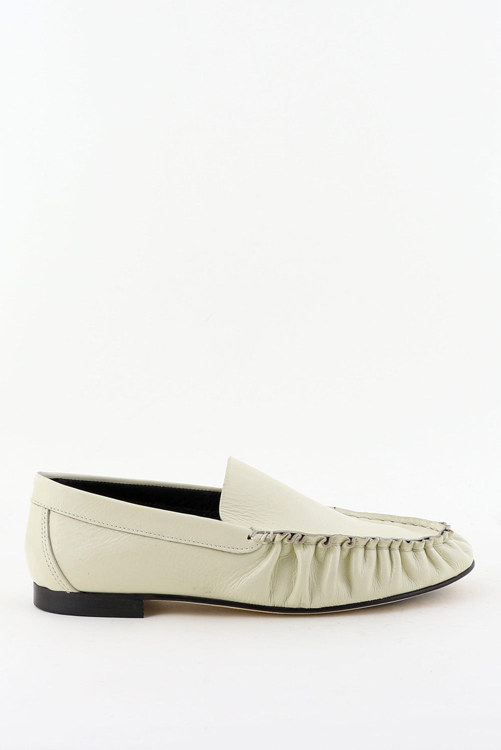 Dit zijn de loafers Elena van Odare. Het lakleer in talco geeft een zachte glans die de geplooide rand rond de neus helder laat uitkomen. De lichte tint krijgt een subtiel contrast door de stiksels, waardoor de vorm rustig en precies blijft. De zwarte platte zool zorgt voor een strak lijnenspel en voelt stevig aan onder de voet. Ze vallen normaal op maat. Odare werkt met Italiaanse ambachtslieden die elk detail met zorg afwerken, wat je hier duidelijk terugziet in de nette lijnen en het gladde oppervlak.