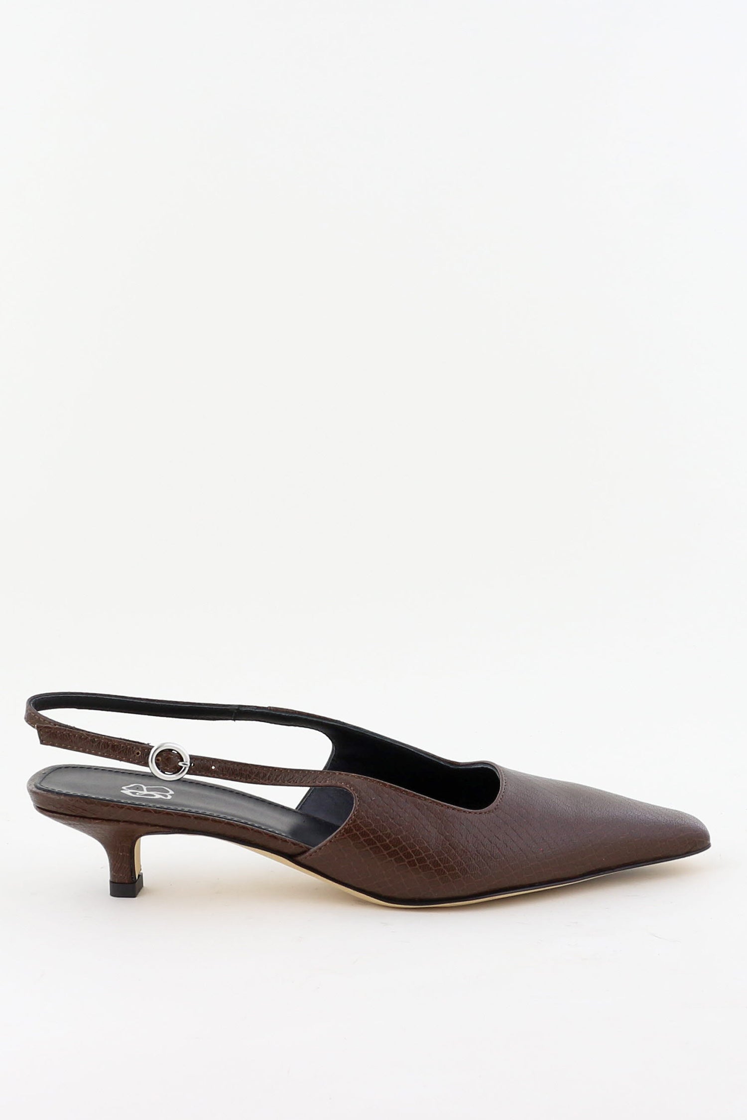 Dit zijn de pumps Anna van Odare. Het geprint leer in bruin, ook wel pitone classic tmoro, geeft de pump een duidelijk patroon dat direct opvalt door de fijne structuur. De puntige neus maakt het silhouet slank en strak, terwijl de lage kitten heel het geheel licht houdt. Het slingback-bandje sluit met een ronde, zilverkleurige gesp en voelt stevig aan zonder zwaar te zijn. De afwerking toont mooi vakmanschap, precies zoals je dat van Italiaanse makers mag verwachten. Ze vallen normaal op maat, dus je kunt uitgaan van je eigen maat.