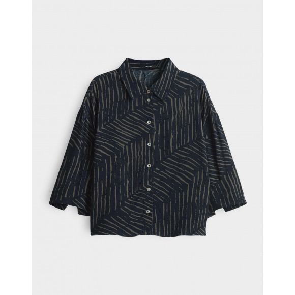Blouse met allover palm print van het merk Opus. Deze blouse heeft een korte mouw, kleine splitjes aan de zijkanten, en een boxy silhouet.