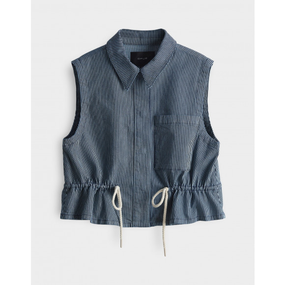 Jeans gilet met streepdessin van het merk Opus. Dit gilet valt recht, maar is leuk te tailleren met het koordje in de taille. Ook heeft dit gilet een kraagje, drukknoop sluiting en twee borstzakjes.