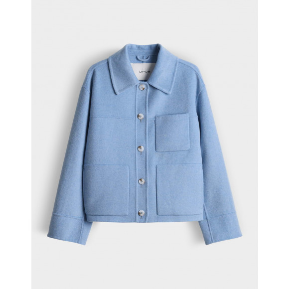 Jasje van Opus. Dit zachte jasje heeft een frisse, moderne uitstraling dankzij de heldere lichtblauwe kleur en de wolachtige kwaliteit. Het rechte, iets boxy silhouet geeft het item een eigentijdse feel, terwijl de grote opgestikte zakken en de klassieke kraag zorgen voor een stoere, vrouwelijke touch. Een perfect jasje voor het tussenseizoen dat comfort en stijl moeiteloos combineert.