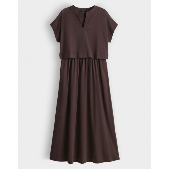 Maxi jurk van het merk Opus in een warme donkerbruine tint. Deze jurk combineert een moderne gelaagde look met ultiem draagcomfort, dankzij het slimme ontwerp met een losvallende top en een soepel vallende rok. De jurk heeft een korte mouw en een subtiele V-hals met split, wat zorgt voor een vrouwelijke en minimalistische uitstraling. De onderjurk is mouwloos en licht getailleerd, terwijl de bovenlaag een speels, los effect geeft. De zachte, stretchy stof voelt prettig aan en beweegt moeiteloos met je mee.