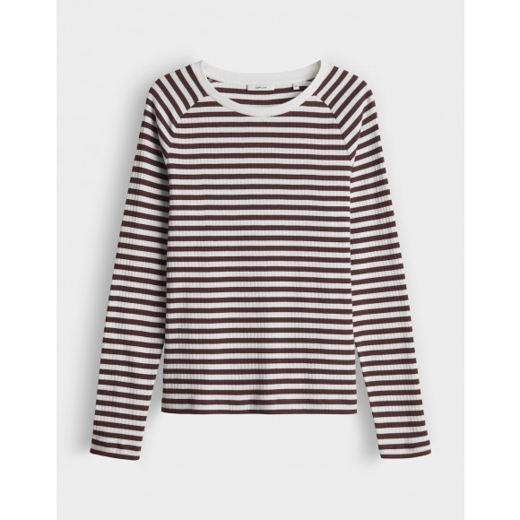Shirt van Opus. Dit fijngebreide shirt met lange mouwen heeft een tijdloze streepprint in warm bruin en offwhite. De ribstructuur zorgt voor een subtiele textuur en een comfortabele, licht aansluitende pasvorm. Dankzij de ronde hals en de zachte kwaliteit is dit een veelzijdige basic die moeiteloos combineert binnen iedere garderobe. Perfect voor een casual look, maar ook stijlvol onder een blazer of vest.