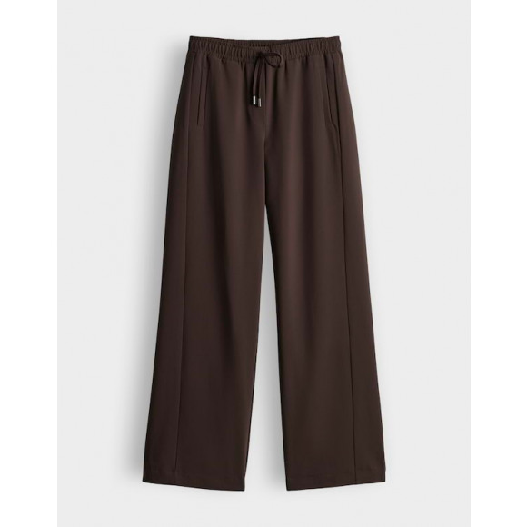 Broek van Opus. Deze soepelvallende broek heeft een elegante, ontspannen uitstraling dankzij de wijde pijpen en de zachte, donkerbruine tint. De elastische tailleband met strikkoord zorgt voor extra comfort en een nonchalante touch, terwijl de vloeiende stof mooi met je meebeweegt. Een veelzijdig item dat zowel casual als gekleed te stylen is.