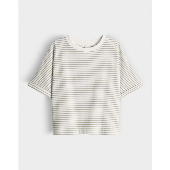 Top met korte mouwen van het merk Opus met een verfijnd streepdessin in zachte groentinten. Een casual en frisse basic die perfect past bij een ontspannen, moderne look. De losse pasvorm en omgeslagen mouwen geven de top een nonchalante uitstraling, terwijl het subtiele streepje zorgt voor een tijdloos en sportief accent.