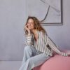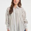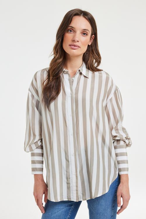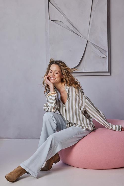 Stijlvol en veelzijdig: Oversized shirt Lisan Taupe offwhite Stripe Het Oversized shirt Lisan Taupe offwhite Stripe is de perfecte aanvulling voor je kledingkast. In een frisse beige en bruine streep is deze blouse zowel tijdloos als trendy. Met zijn lange mouwen en sierlijke klassieke kraag straalt het elegantie uit. De knoopsluiting voegt een speels detail toe, terwijl de loose fit en oversized pasvorm zorgen voor een comfortabele en luchtige drapering. Ideaal voor zonnige lentedagen en zwoele zomeravonden. De blouse vangt het licht prachtig op en biedt zowel stijl als gemak. Gemaakt van hoogwaardige stof Met een samenstelling van 82% viscose en 18% nylon, biedt deze blouse een zachte en ademende ervaring. Viscose zorgt voor een zijdezachte textuur en luchtigheid die perfect is voor warmer weer, terwijl nylon de stof duurzaam en veerkrachtig maakt. Deze combinatie garandeert dat je blouse zijn pasvorm behoudt, was na was, en lang mooi blijf. Stijladvies De Oversized shirt Lisan Taupe offwhite Stripe is veelzijdig te combineren. Draag hem met een lekker passende broek of een casual jeans voor een stijlvolle, dagelijkse look. Met zijn klassieke streep is deze blouse ook perfect te combineren met felle accessoires voor een speelse touch. Wasvoorschrift Was instructie: Houd je blouse op zijn mooist door deze te wassen op 30 graden. Vermijd bleken en chemisch reinigen om de stof in topconditie te houden. Droogvoorschrift: Hang de blouse liever te drogen dan in de droger te gebruiken. Zo behoud je de vorm en textuur van de stof. Strijkvoorschrift: Strijk de blouse op een lage temperatuur om de toenemende stijl en zachtheid van de stof te behouden. Met het Oversized shirt Lisan Taupe offwhite Stripe voeg je een stijlvol en veelzijdig item toe aan je collectie, geschikt voor elke gelegenheid.