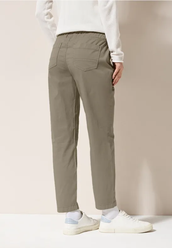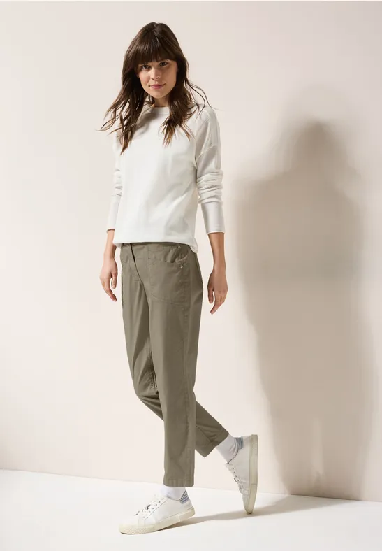 Deze damesbroek van CECIL maakt indruk met zijn casual pasvorm en moderne papertouch-stof. De Mid Waist en Slim Legs zorgen voor een flatterend silhouet. Zijzakken en een knoopdetail op de tailleband geven deze broek een stijlvolle touch.