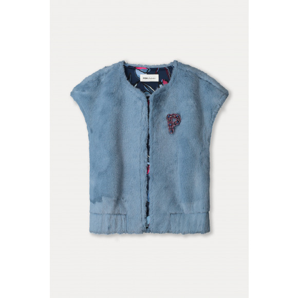 Gilet van POM Amsterdam. Dit lichtblauwe gilet is gemaakt van een zachte faux fur kwaliteit die heerlijk warm en comfortabel draagt. De voering heeft een speelse bloemenprint en op de borst is een opvallende broche in de vorm van de letter P bevestigd, wat zorgt voor een unieke en eigentijdse uitstraling. Een ideaal laagje om je outfit net dat beetje extra te geven.
