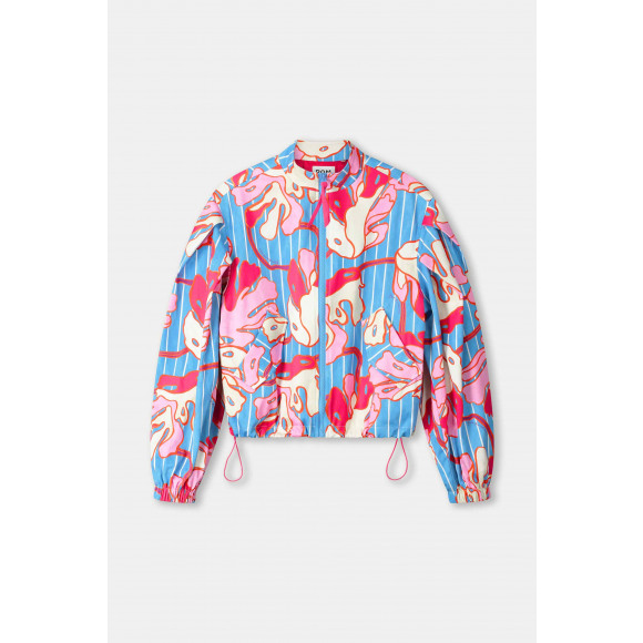 Jasje van POM Amsterdam. Dit kleurrijke jasje is een echte statement piece! De frisse blauwe streepprint gecombineerd met de speelse bloemen in roze- en oranjetinten geeft meteen een zomerse vibe. Dankzij de rits en elastische boorden heeft het jasje een sportieve uitstraling, terwijl de print juist zorgt voor die typische POM-fun.
