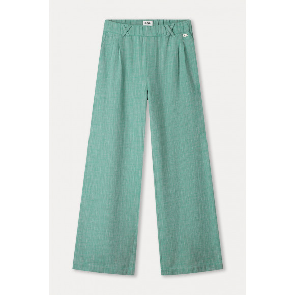 Broek met wijde pijpen van het merk POM Amsterdam in een frisse groene tint met een subtiele structuur in de stof. Deze stijlvolle broek heeft een comfortabele tailleband en een elegante, soepel vallende pasvorm die zorgt voor een moderne en vrouwelijke uitstraling. De lichte structuur geeft de broek een luxe en zomerse look.