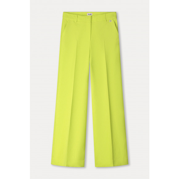 Mooie opvallende pantalon in lime kleur van het merk Pom Amsterdam. De broek heeft een wijde pasvorm, afgewerkt met steekzakken aan de voorzijde en een haak en oog sluiting in de boord.