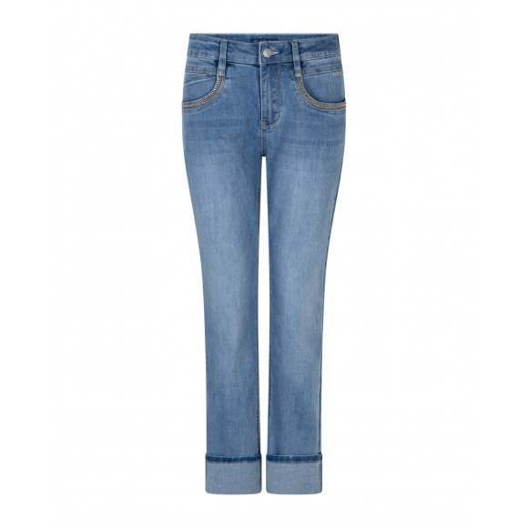 * Details: lichtblauwe wassing en vaste omslag aan de pijpen