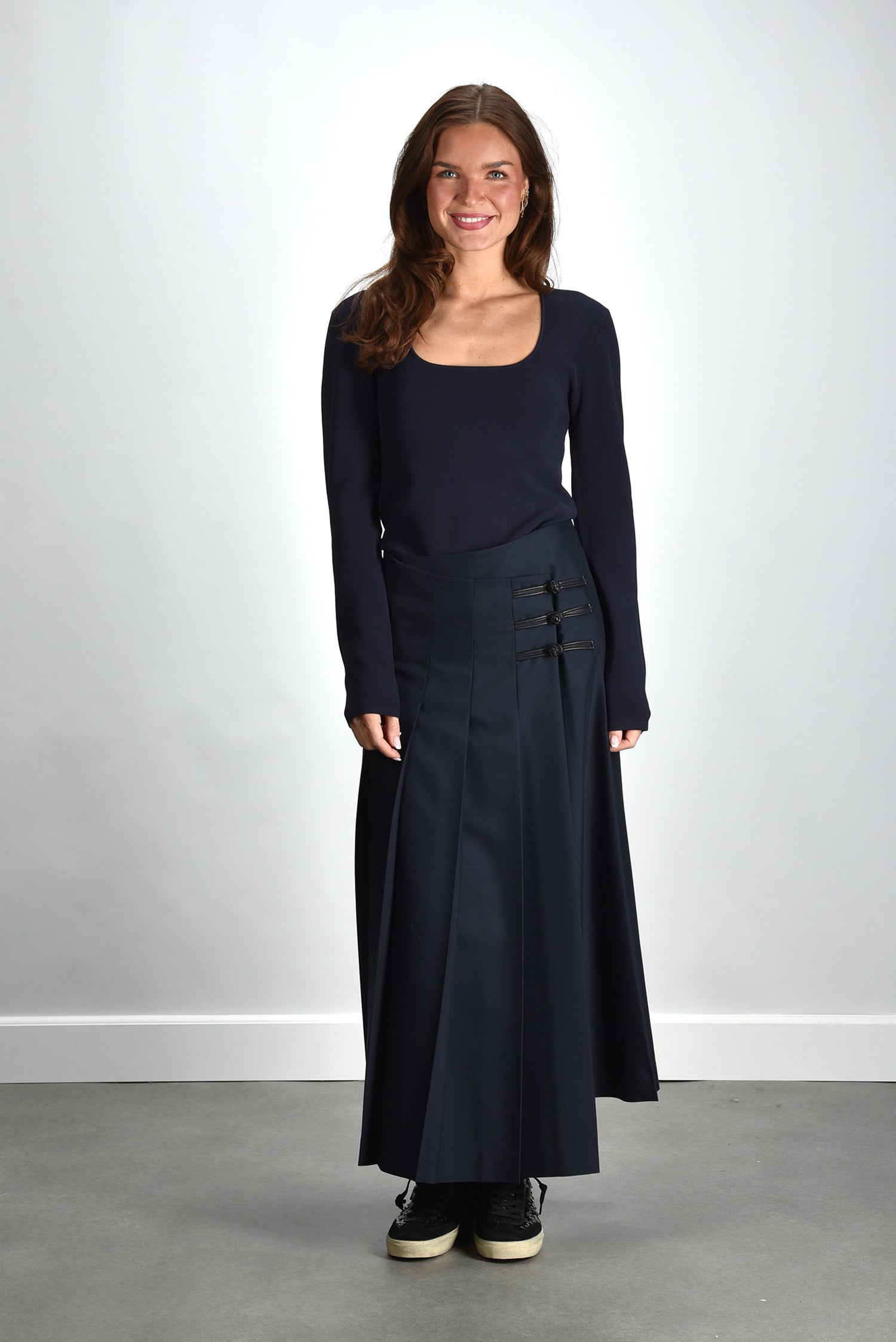 De rok met leren sluitingen van RÓHE valt direct op door de drie leren gespen aan de zijkant. De lange, wijde pasvorm zorgt voor een elegante, vloeiende lijn tijdens het lopen. De subtiele plooien over de volledige lengte versterken dat soepele effect. De stof, een mix van wol en polyester, houdt de rok mooi in vorm en voelt stevig aan. De diepe navy kleur biedt een rustige basis die prettig draagt. Combineer hem met de Golden Goose sneakers Soulstar voor een contrast tussen stoer en subtiel.