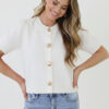 Een kortemouwen vestje in een ecru tint, afgewerkt met zee-geïnspireerde gouden knopen voor een luxe en zomerse uitstraling. Perfect om moeiteloos elke outfit te verfijnenSizes: ONE SIZE, suitable for ladies with sizes S(36), M(38), L(40) Fit: valt als normaalModel: 178 cm and wears size One SizeDetails: ronde hals, korte mouwen and gouden knopen Materials: 3% Elastaan, 6% Wol, 26% Acryl, 65% PolyesterWashing instructions: 30 graden wasmachineFor best results: niet in de droger, geen wasverzachter