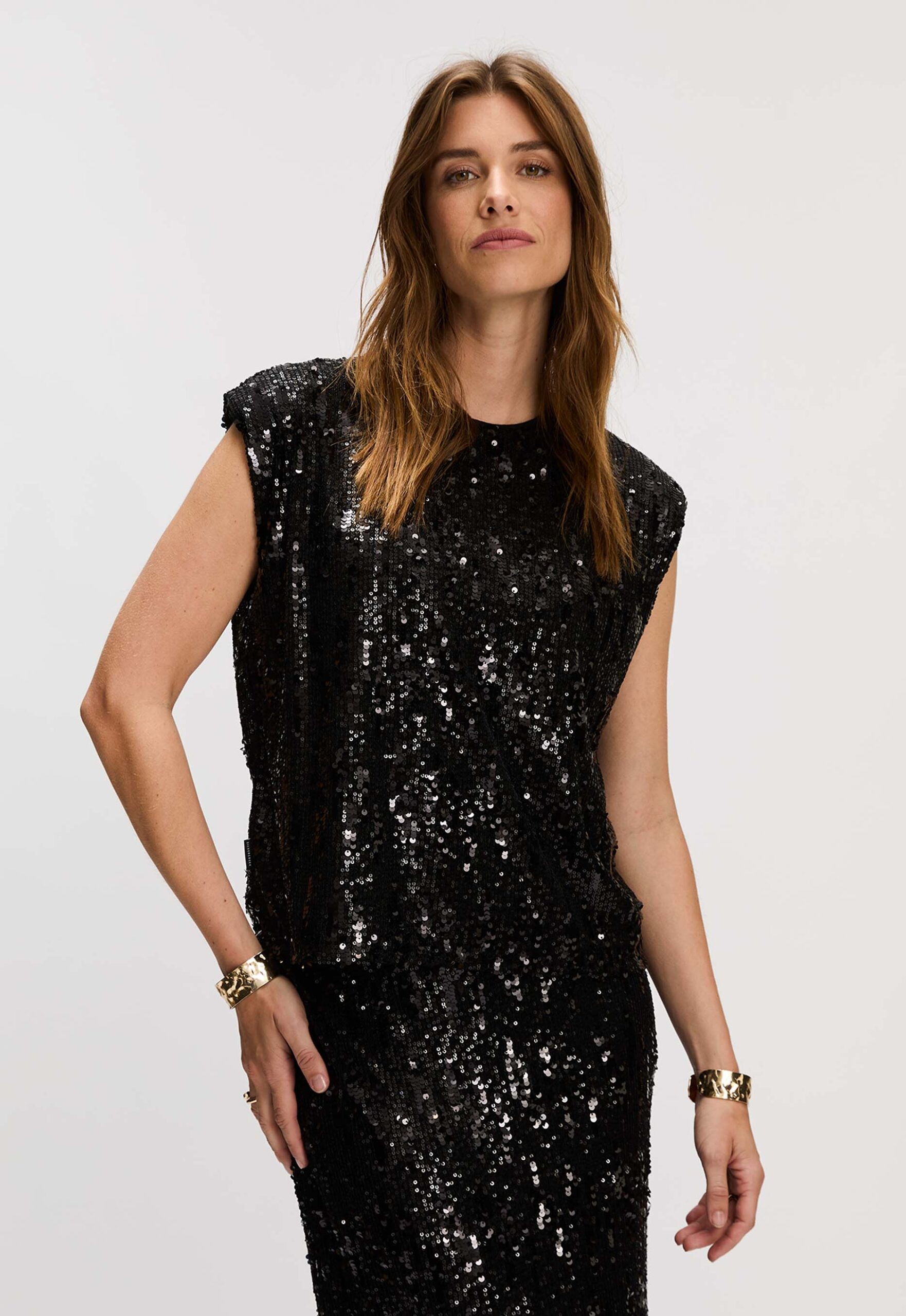 Dit is de Katy Top van het merk Silvercreek. Deze top heeft een small pasvorm en is volledig gemaakt van polyester, wat zorgt voor een elegante uitstraling en comfortabele draagbaarheid. De pailletten all-over print geeft de top een feestelijke touch, terwijl de schoudervulling een moderne look creëert. Aan de achterkant vind je een keyhole sluiting met een klein knoopje en elastieke lus.
