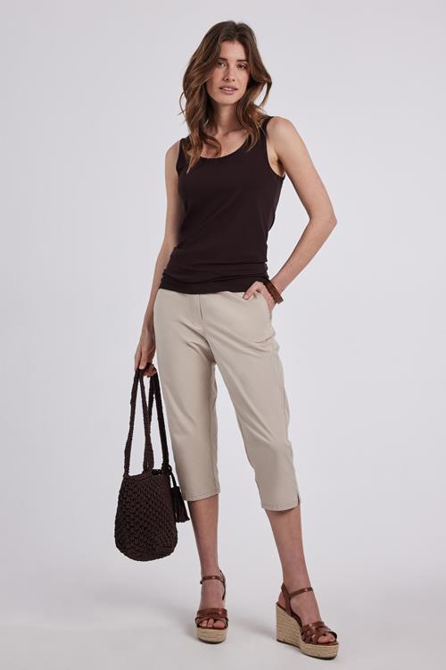 Singlet Ruby Chocolate brown: Jouw Favoriete Stuk voor Alle Seizoenen Ervaar de veelzijdigheid en het comfort van de Singlet Ruby Chocolate brown. Met zijn elegante beige en bruine tinten en de regular fit pasvorm, biedt deze singlet een tijdloze uitstraling. Ideaal voor warme dagen of als stijlvolle laag onder jouw favoriete blazers en vesten. De mouwloze constructie en ronde hals zorgen voor een moeiteloze look die het hele jaar door gedragen kan worden. Gemaakt van hoogwaardige stof De Singlet Ruby Chocolate brown is vervaardigd uit 95% viscose en 5% elasthan. Deze combinatie zorgt voor een zachte, ademende en rekbare stof die zich vormt naar je lichaam zonder in te leveren op comfort. Viscose staat bekend om zijn zijdezachte gevoel en elasthan biedt net dat beetje extra stretch, waardoor het kledingstuk perfect meegaat met al je bewegingen. Stijladvies De veelzijdige kleur en design van deze singlet maken het een uitstekende keuze voor diverse outfits. Draag het met een mooie jeans voor een casual, maar toch verfijnde uitstraling. Voeg een paar opvallende accessoires toe om je look compleet te maken voor zowel overdag als ’s avonds. Wasvoorschrift Was instructie: Was deze singlet op 30 graden om de stoffen en kleur zo lang mogelijk mooi te houden. Vermijd bleekmiddelen om schade te voorkomen. Droogvoorschrift: Hang het kledingstuk na het wassen op om te drogen. Zo behoud je de kwaliteit langer en voorkom je krimpen. Strijkvoorschrift: Strijk indien nodig op een lage temperatuur om de soepele structuur en glans van de stof te behouden zonder het te beschadigen. Met deze zorgvuldig samengestelde instructies blijft je Singlet Ruby Chocolate brown lang mooi en comfortabel, zodat je er eindeloos van kunt genieten.